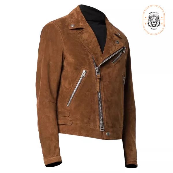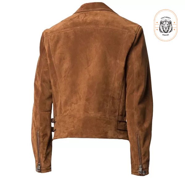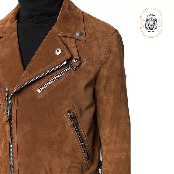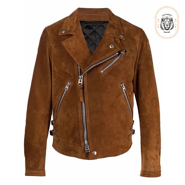 Add a rugged yet refined edge to your wardrobe with this Men’s Brown Suede Moto Leather Jacket. Crafted from premium suede leather, this jacket delivers a perfect balance of sophistication and moto-inspired attitude. The rich brown hue enhances its vintage appeal, while moto elements like a lapel collar, zip-up cuffs, and asymmetrical front zipper offer an effortlessly cool vibe. Designed with three front pockets and one inner pocket, it’s as functional as it is stylish. A soft inner lining ensures comfort for all-day wear.